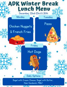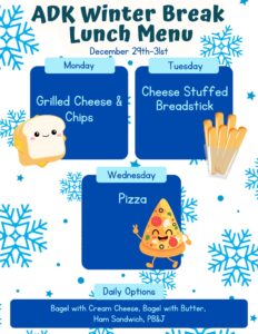 | Holiday Break* | Monday, December 22nd | Tuesday, December 23rd | Afrim’s ADK | Register Today! |